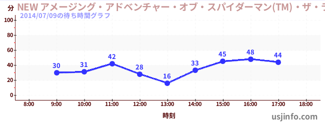 • NEW アメージング・アドベンチャー・オブ・スパイダーマン(TM)・ザ・ライド 4K3D$B$N(B2014年07月09日の待ち時間