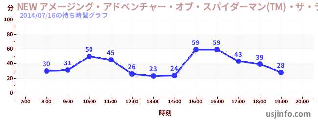 • NEW アメージング・アドベンチャー・オブ・スパイダーマン(TM)・ザ・ライド 4K3D$B$N(B2014年07月16日の待ち時間