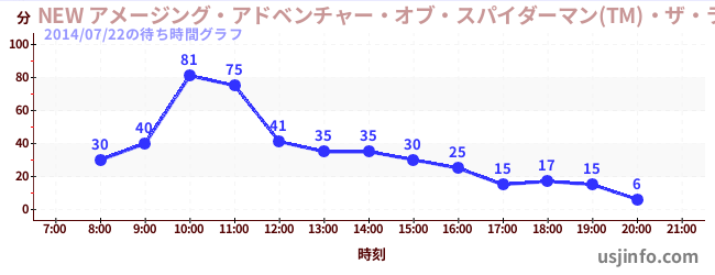 • NEW アメージング・アドベンチャー・オブ・スパイダーマン(TM)・ザ・ライド 4K3D$B$N(B2014年07月22日の待ち時間