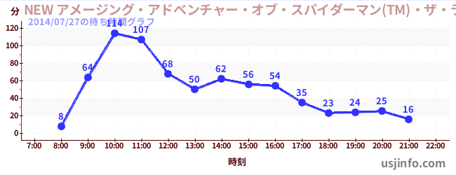 • NEW アメージング・アドベンチャー・オブ・スパイダーマン(TM)・ザ・ライド 4K3D$B$N(B2014年07月27日の待ち時間