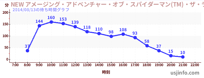 • NEW アメージング・アドベンチャー・オブ・スパイダーマン(TM)・ザ・ライド 4K3D$B$N(B2014年08月13日の待ち時間