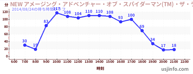 • NEW アメージング・アドベンチャー・オブ・スパイダーマン(TM)・ザ・ライド 4K3D$B$N(B2014年08月24日の待ち時間