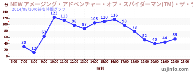 • NEW アメージング・アドベンチャー・オブ・スパイダーマン(TM)・ザ・ライド 4K3D$B$N(B2014年08月30日の待ち時間