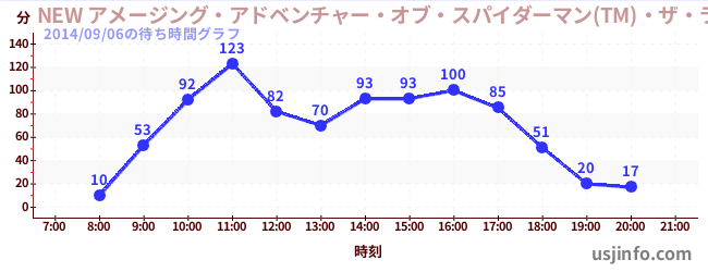 • NEW アメージング・アドベンチャー・オブ・スパイダーマン(TM)・ザ・ライド 4K3D$B$N(B2014年09月06日の待ち時間