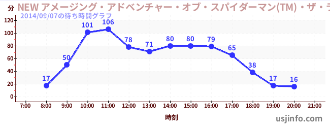 • NEW アメージング・アドベンチャー・オブ・スパイダーマン(TM)・ザ・ライド 4K3D$B$N(B2014年09月07日の待ち時間