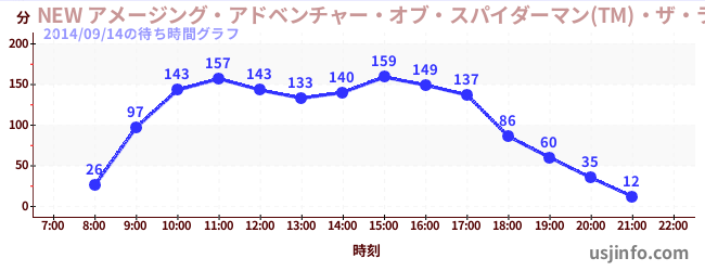 • NEW アメージング・アドベンチャー・オブ・スパイダーマン(TM)・ザ・ライド 4K3D$B$N(B2014年09月14日の待ち時間