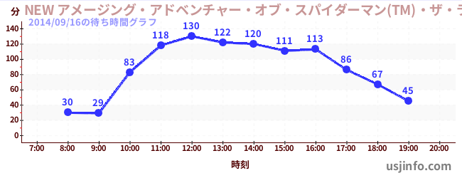 • NEW アメージング・アドベンチャー・オブ・スパイダーマン(TM)・ザ・ライド 4K3D$B$N(B2014年09月16日の待ち時間