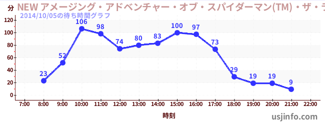 • NEW アメージング・アドベンチャー・オブ・スパイダーマン(TM)・ザ・ライド 4K3D$B$N(B2014年10月05日の待ち時間
