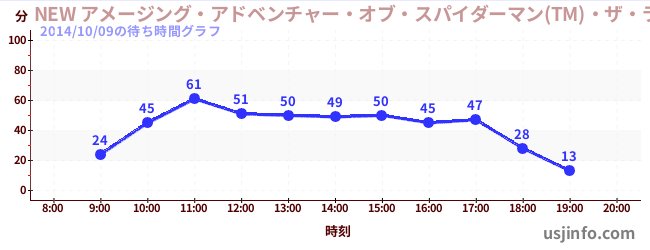 • NEW アメージング・アドベンチャー・オブ・スパイダーマン(TM)・ザ・ライド 4K3D$B$N(B2014年10月09日の待ち時間