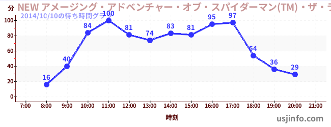 • NEW アメージング・アドベンチャー・オブ・スパイダーマン(TM)・ザ・ライド 4K3D$B$N(B2014年10月10日の待ち時間