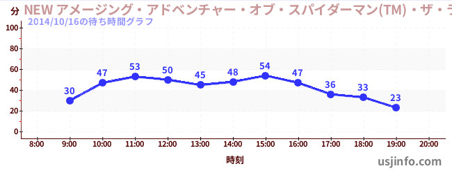 • NEW アメージング・アドベンチャー・オブ・スパイダーマン(TM)・ザ・ライド 4K3D$B$N(B2014年10月16日の待ち時間