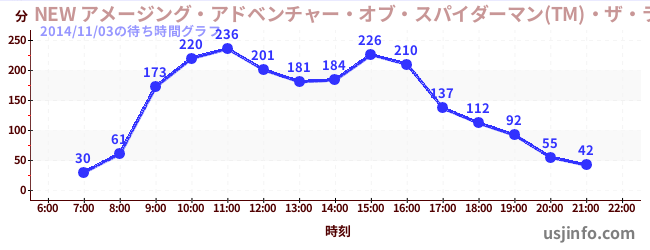 • NEW アメージング・アドベンチャー・オブ・スパイダーマン(TM)・ザ・ライド 4K3D$B$N(B2014年11月03日の待ち時間
