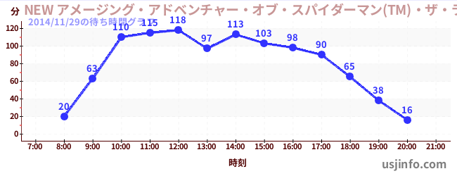 • NEW アメージング・アドベンチャー・オブ・スパイダーマン(TM)・ザ・ライド 4K3D$B$N(B2014年11月29日の待ち時間