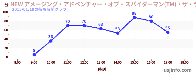 • NEW アメージング・アドベンチャー・オブ・スパイダーマン(TM)・ザ・ライド 4K3D$B$N(B2015年01月19日の待ち時間