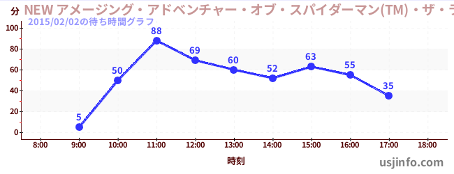• NEW アメージング・アドベンチャー・オブ・スパイダーマン(TM)・ザ・ライド 4K3D$B$N(B2015年02月02日の待ち時間