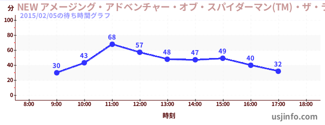 • NEW アメージング・アドベンチャー・オブ・スパイダーマン(TM)・ザ・ライド 4K3D$B$N(B2015年02月05日の待ち時間