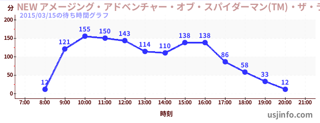 • NEW アメージング・アドベンチャー・オブ・スパイダーマン(TM)・ザ・ライド 4K3D$B$N(B2015年03月15日の待ち時間