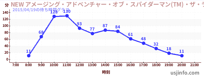 • NEW アメージング・アドベンチャー・オブ・スパイダーマン(TM)・ザ・ライド 4K3D$B$N(B2015年04月19日の待ち時間