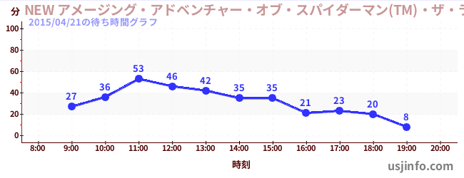 • NEW アメージング・アドベンチャー・オブ・スパイダーマン(TM)・ザ・ライド 4K3D$B$N(B2015年04月21日の待ち時間