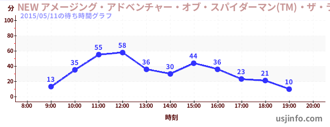 • NEW アメージング・アドベンチャー・オブ・スパイダーマン(TM)・ザ・ライド 4K3D$B$N(B2015年05月11日の待ち時間