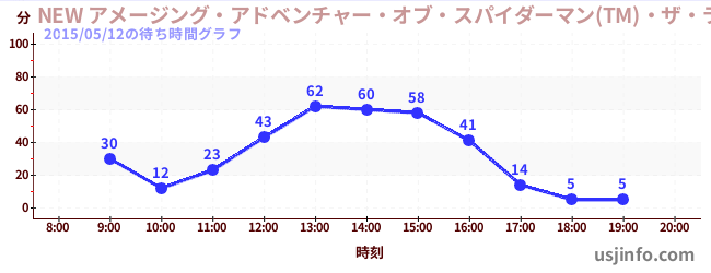 • NEW アメージング・アドベンチャー・オブ・スパイダーマン(TM)・ザ・ライド 4K3D$B$N(B2015年05月12日の待ち時間