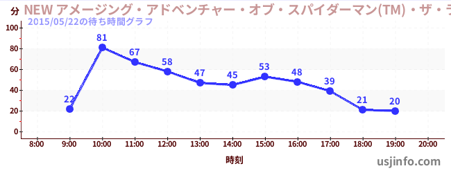 • NEW アメージング・アドベンチャー・オブ・スパイダーマン(TM)・ザ・ライド 4K3D$B$N(B2015年05月22日の待ち時間