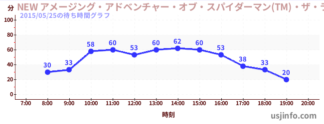 • NEW アメージング・アドベンチャー・オブ・スパイダーマン(TM)・ザ・ライド 4K3D$B$N(B2015年05月25日の待ち時間