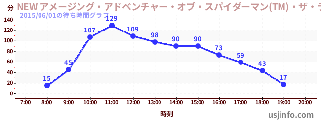 • NEW アメージング・アドベンチャー・オブ・スパイダーマン(TM)・ザ・ライド 4K3D$B$N(B2015年06月01日の待ち時間