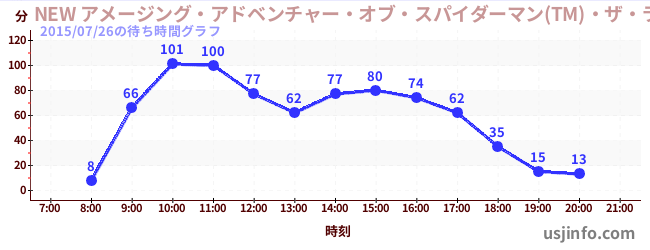 • NEW アメージング・アドベンチャー・オブ・スパイダーマン(TM)・ザ・ライド 4K3D$B$N(B2015年07月26日の待ち時間