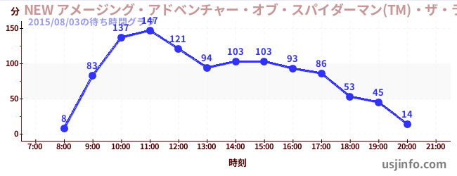 • NEW アメージング・アドベンチャー・オブ・スパイダーマン(TM)・ザ・ライド 4K3D$B$N(B2015年08月03日の待ち時間