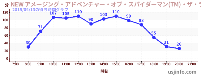 • NEW アメージング・アドベンチャー・オブ・スパイダーマン(TM)・ザ・ライド 4K3D$B$N(B2015年09月13日の待ち時間