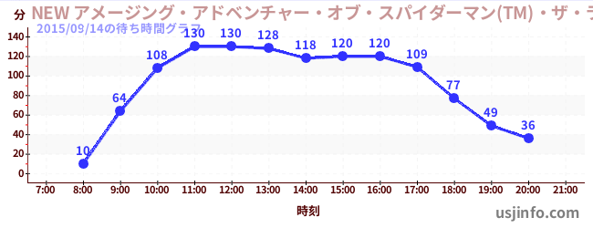 • NEW アメージング・アドベンチャー・オブ・スパイダーマン(TM)・ザ・ライド 4K3D$B$N(B2015年09月14日の待ち時間