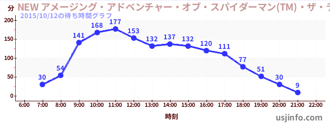 • NEW アメージング・アドベンチャー・オブ・スパイダーマン(TM)・ザ・ライド 4K3D$B$N(B2015年10月12日の待ち時間