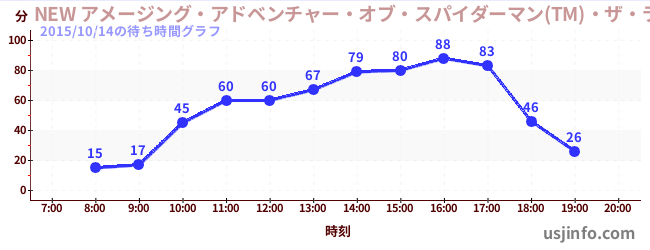 • NEW アメージング・アドベンチャー・オブ・スパイダーマン(TM)・ザ・ライド 4K3D$B$N(B2015年10月14日の待ち時間