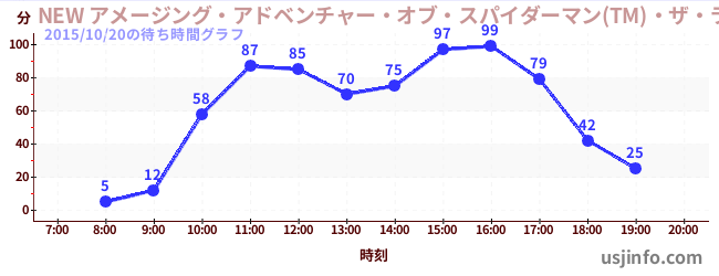 • NEW アメージング・アドベンチャー・オブ・スパイダーマン(TM)・ザ・ライド 4K3D$B$N(B2015年10月20日の待ち時間