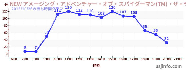 • NEW アメージング・アドベンチャー・オブ・スパイダーマン(TM)・ザ・ライド 4K3D$B$N(B2015年10月26日の待ち時間