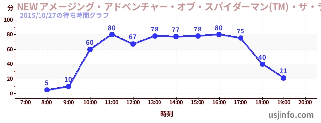 • NEW アメージング・アドベンチャー・オブ・スパイダーマン(TM)・ザ・ライド 4K3D$B$N(B2015年10月27日の待ち時間