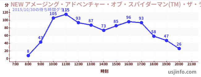 • NEW アメージング・アドベンチャー・オブ・スパイダーマン(TM)・ザ・ライド 4K3D$B$N(B2015年10月30日の待ち時間