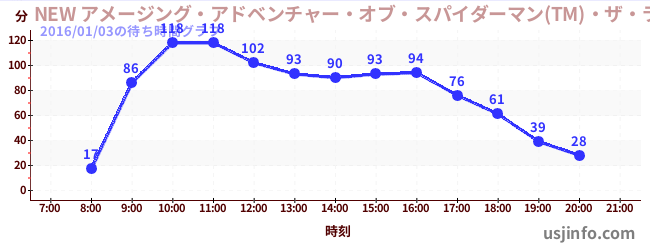 • NEW アメージング・アドベンチャー・オブ・スパイダーマン(TM)・ザ・ライド 4K3D$B$N(B2016年01月03日の待ち時間