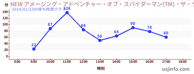• NEW アメージング・アドベンチャー・オブ・スパイダーマン(TM)・ザ・ライド 4K3D$B$N(B2016年01月13日の待ち時間