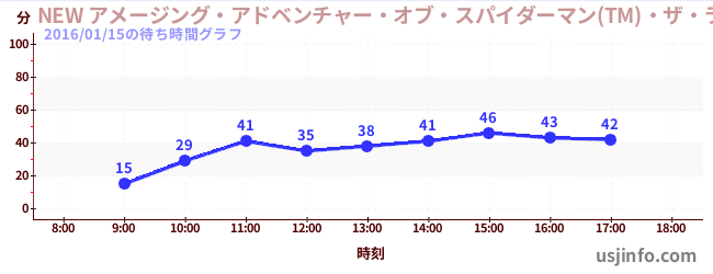 • NEW アメージング・アドベンチャー・オブ・スパイダーマン(TM)・ザ・ライド 4K3D$B$N(B2016年01月15日の待ち時間