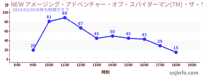 • NEW アメージング・アドベンチャー・オブ・スパイダーマン(TM)・ザ・ライド 4K3D$B$N(B2016年02月05日の待ち時間