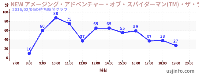 • NEW アメージング・アドベンチャー・オブ・スパイダーマン(TM)・ザ・ライド 4K3D$B$N(B2016年02月06日の待ち時間