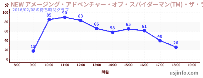 • NEW アメージング・アドベンチャー・オブ・スパイダーマン(TM)・ザ・ライド 4K3D$B$N(B2016年02月08日の待ち時間
