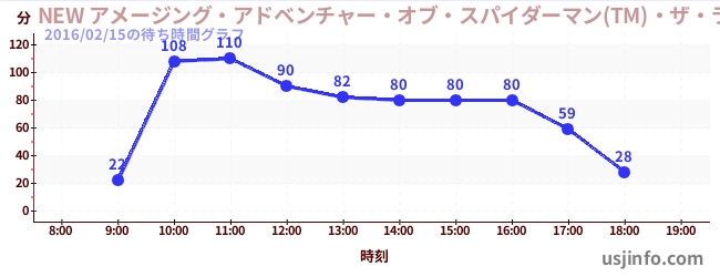 • NEW アメージング・アドベンチャー・オブ・スパイダーマン(TM)・ザ・ライド 4K3D$B$N(B2016年02月15日の待ち時間