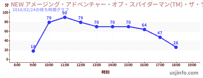 • NEW アメージング・アドベンチャー・オブ・スパイダーマン(TM)・ザ・ライド 4K3D$B$N(B2016年02月24日の待ち時間