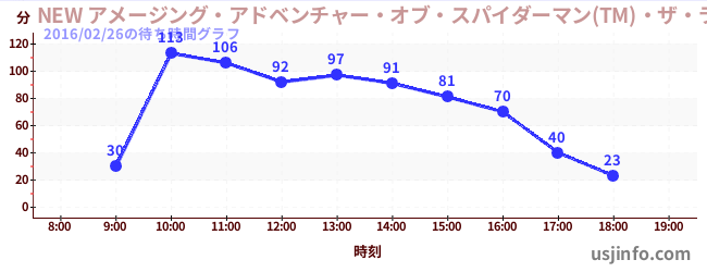 • NEW アメージング・アドベンチャー・オブ・スパイダーマン(TM)・ザ・ライド 4K3D$B$N(B2016年02月26日の待ち時間