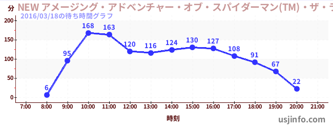 • NEW アメージング・アドベンチャー・オブ・スパイダーマン(TM)・ザ・ライド 4K3D$B$N(B2016年03月18日の待ち時間
