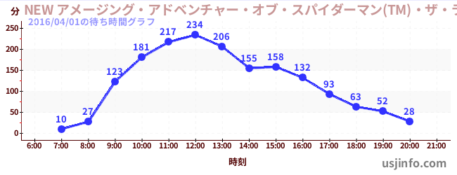 • NEW アメージング・アドベンチャー・オブ・スパイダーマン(TM)・ザ・ライド 4K3D$B$N(B2016年04月01日の待ち時間