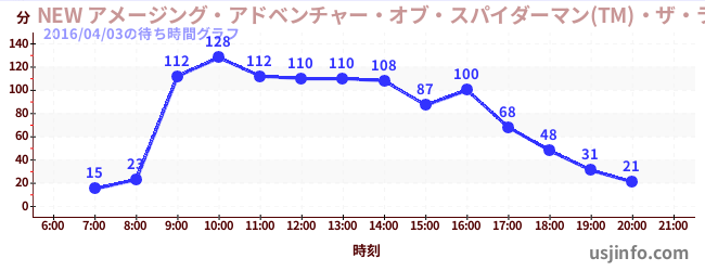 • NEW アメージング・アドベンチャー・オブ・スパイダーマン(TM)・ザ・ライド 4K3D$B$N(B2016年04月03日の待ち時間